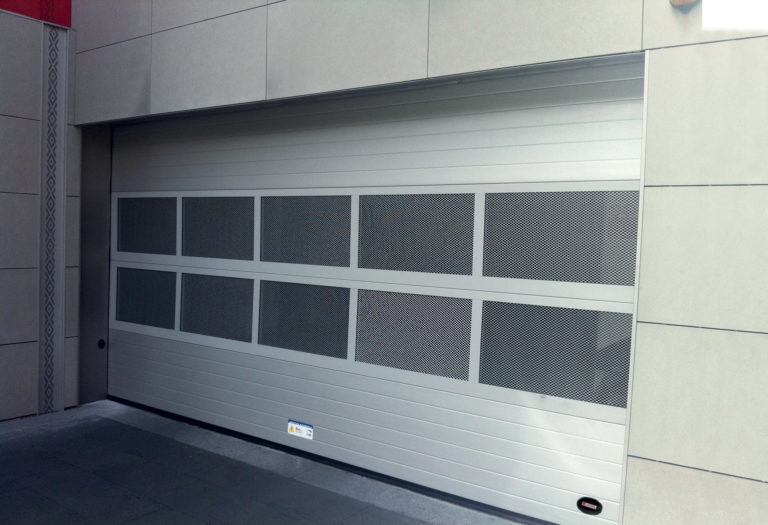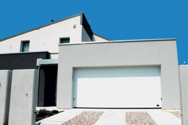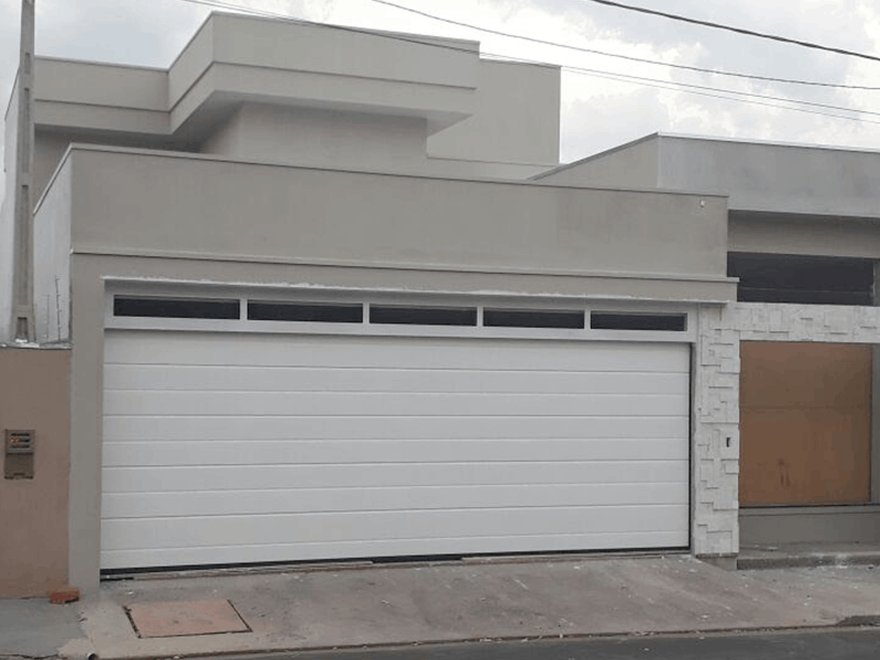 Portões seccionados com perfeita combinação de cor branca, entre a elegância contemporânea da superfície lisa e o estilo clássico da grande ranhura central.